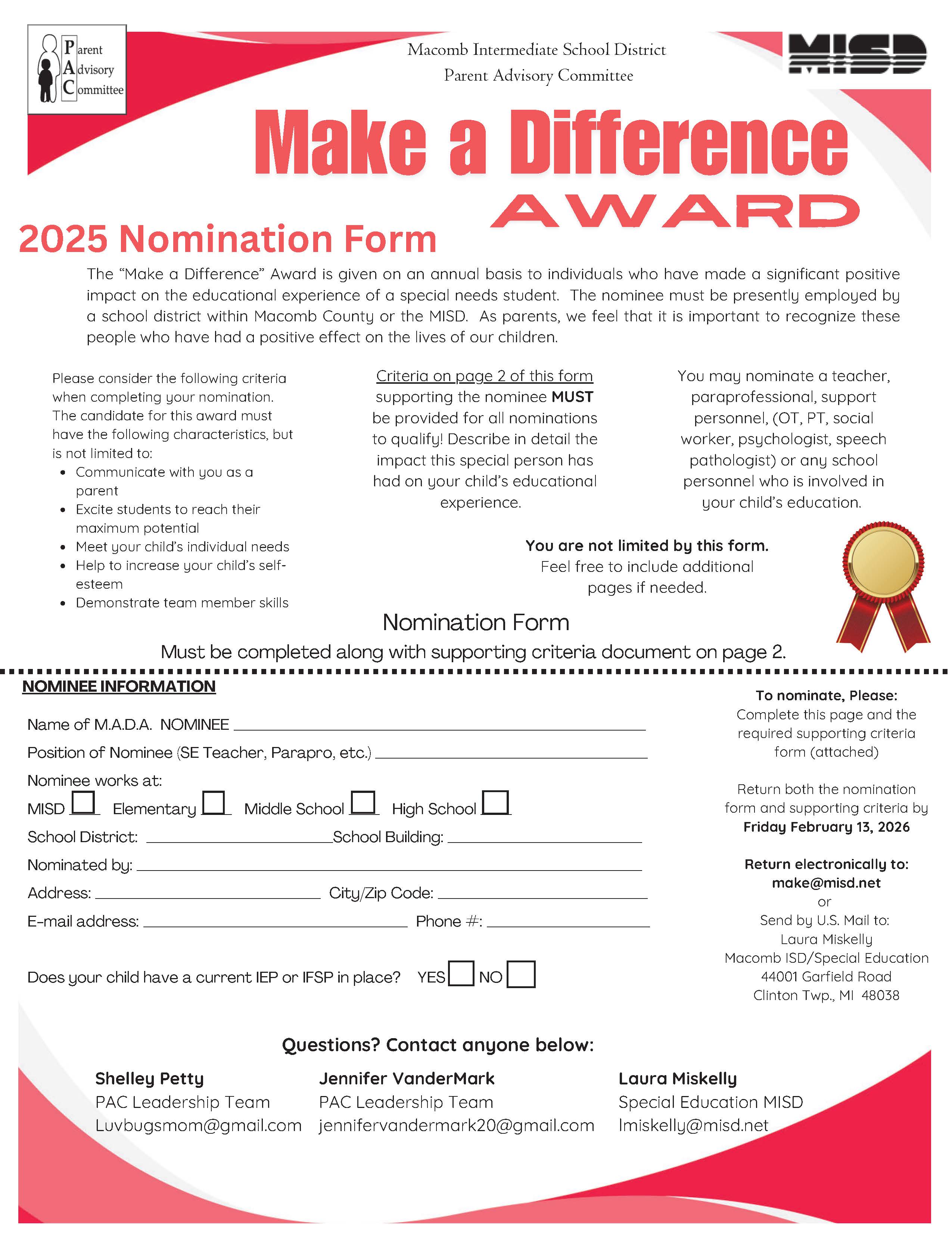 a school district within Macomb County or the MISD. As parents, we feel that it is important to recognize these people who have had a positive effect on the lives of our children.
