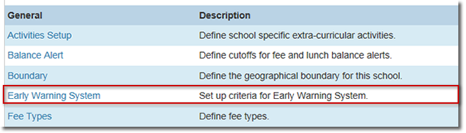 There is a link to Early Warning System setup on the School Setup page in PowerSchool under the General heading.