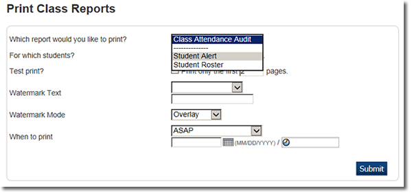 In the following screen teachers can choose the Student Alert report and Submit: