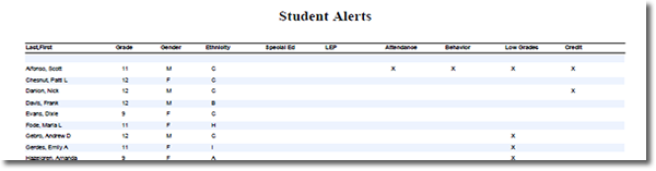 The report shows all students in the selected class with their current alerts: